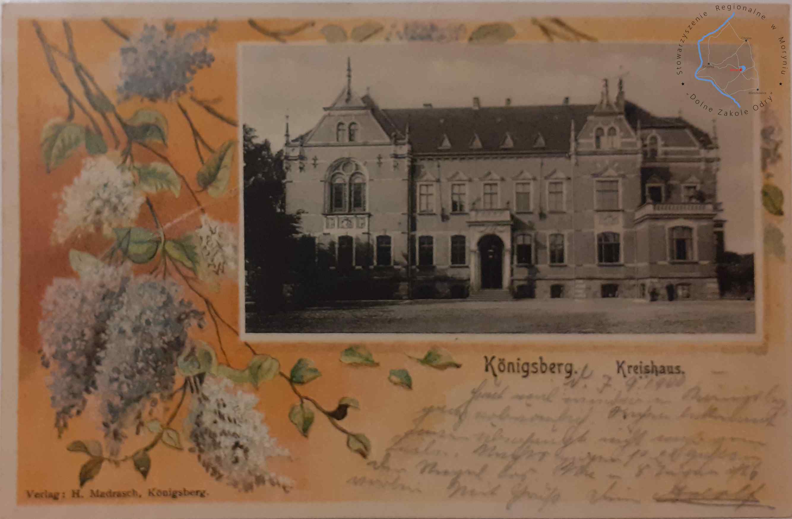 Pocztówka z obiegu, poczta Chojna 7. 9. 1900Wydawca: H. Madrasch, Konigsberg (Chojna)Budynek dawnego Starostwa Powiato...