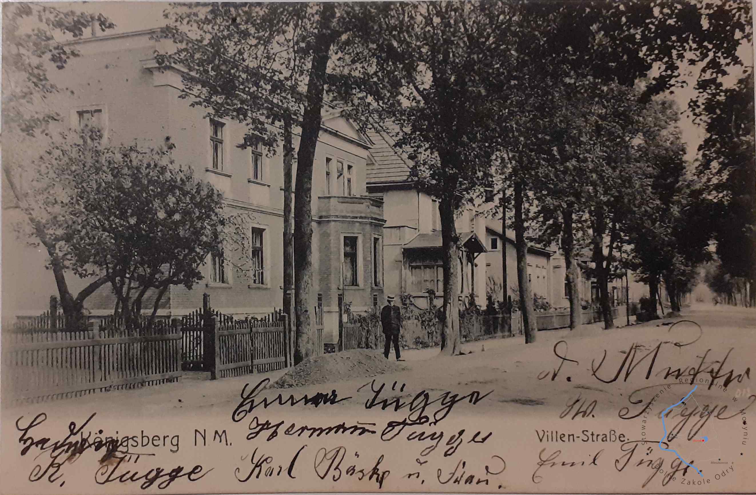 Pocztówka bez obieguWydawca: H. Madrasch, Konigsberg Nm. (Chojna)Ulica Demokracji i dzisiejszy urząd pocztowy